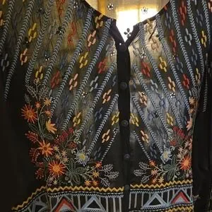 Elegant black slightly sheer blouse/woven cardigan with subtle floral accents. Perfect for layering.