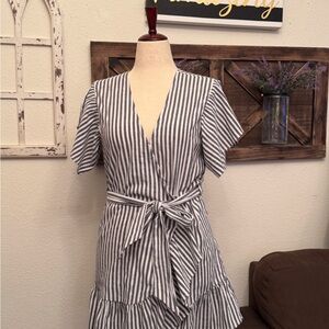 Perfect preloved condition. True wrap style dress with gray and white stripe pattern. Wrap design and tie waist with ruffle hem. Perfect for casual outings.