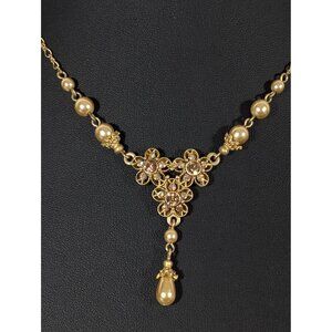1928 Golden Aurora Borealis Faux Pearl Flower Y-Drop Necklace 19" Elegant