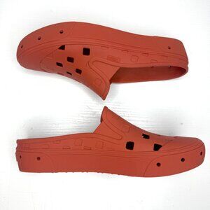 Model: Slip On Mule TRK US Size: 11 Color: Burnt Orange Brown Closure: slip on Upper: rubber Insole: rubber, waffle sole Outsole: rubber Waterproof Breathable & rinsable Minor cosmetic blemish and wear from normal wear No tears, no holes, in great condition