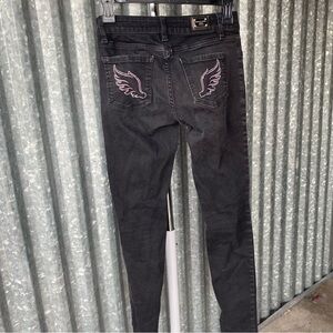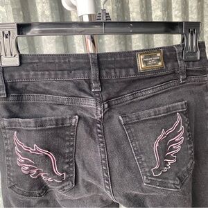 Rocker designer jeggings by Philipp Plein featuring pink angel wing embroidered back pockets, stretch denim material, logo’d silver hardware and bold brand placket on the back. Sold out and originally $1145. Excellent condition! Women’s size 26 (see measurements)