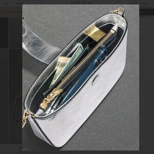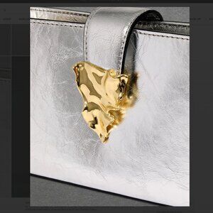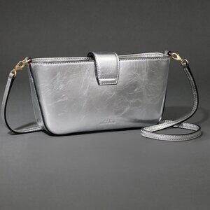 **Features Alexis Bittar's signature crumpled 14k gold metalwork as the clasp and focal point for this new silhouette, in full grain goat Italian leather with a special hand-crafted metallic silver foil finish.