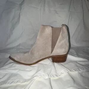 Stylish and versatile Marc Fisher suede ankle booties in a beautiful taupe shade. Features a sleek pointed toe, stacked low block heel, and pull-on style with stretch side panels for comfort and ease. Neutral color makes them easy to pair with jeans, dresses, or fall layers.