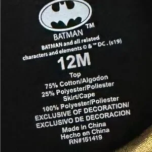 Embrace the superhero spirit with this striking Batman dress, featuring a black velvet bodice and a gold metallic waist. The tutu-style skirt adds a playful touch, while the iconic Batman emblem in black and gold completes the look.