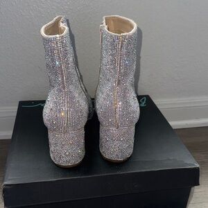 Shimmering silver booties with glitter finish. Perfect for a glamorous look.