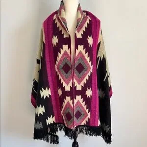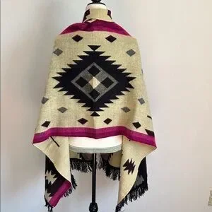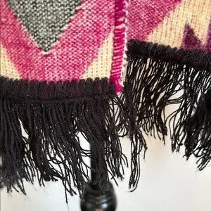 Add a bright southwestern flair to your cold weather wardrobe with this thick and cozy oversized shawl. This has classic Aztec designs woven in cream, black, purple and shades of pink with a tassel fringe on the ends. No tags and a burn test indicates acrylic or acrylic blend. Great condition with no damage.