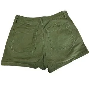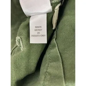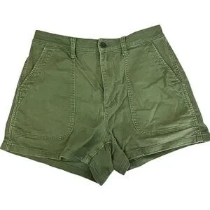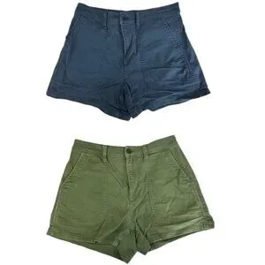 The product is a lot of two Madewell size 29 shorts in a vintage fatigue style in desert green and blue colors. These casual shorts feature a flat front with a high rise waist and a 3-inch inseam. Made from machine washable material, they have a button accent with pockets for added convenience. Perfect for summer and spring, these chino-style shorts are ideal for casual wear and walking activities. Imported from China, they are designed for regular size women and offer a comfortable fit.