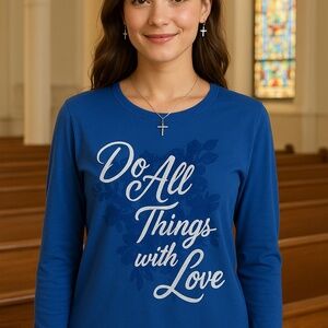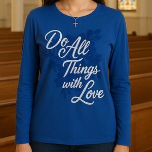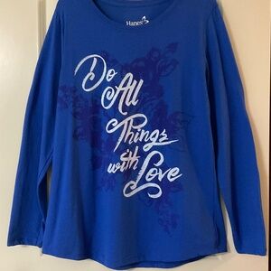 Comfy and stylish Hanes women’s long sleeve shirt in dark blue. Features an inspiring graphic text design that reads “Do All Things with Love.” Soft fabric with a relaxed fit, perfect for casual wear, layering, or lounging.