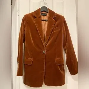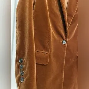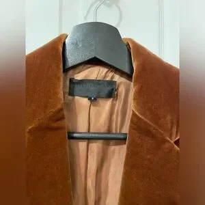 Crafted from luxurious velvet, this brown blazer by Nili Lotan offers a sophisticated touch to any ensemble. Its tailored silhouette and rich color make it an ideal choice for both casual and formal occasions. Another photo in dark brown just to show jacket, I’m selling this in burnt orange/brown.