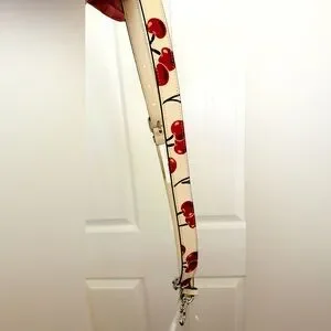 Super cute leather crossbody bag strap by Coach embossed with their cherry pattern. Silver accents. Can be used to replace a strap or add a crossbody option to your bag. New with tags.