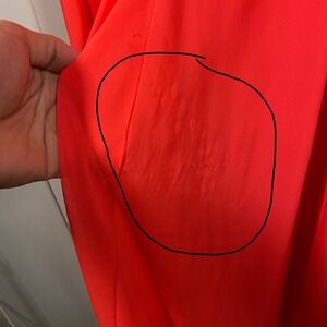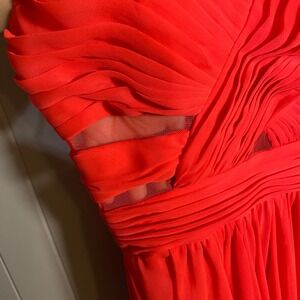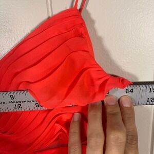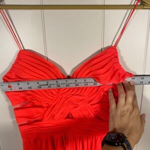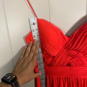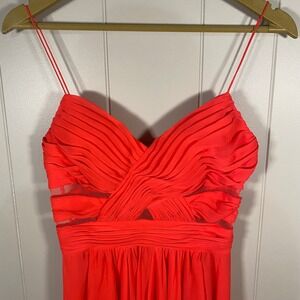 Keywords: Hailey Logan, Adrianna Papell, Coral, Neon, High low dress, Formal, Evening gown, Prom dress, Ruched dress, Chiffon, Size 7, Size 8, Spaghetti strap, Party, Mesh dress, Special occasion