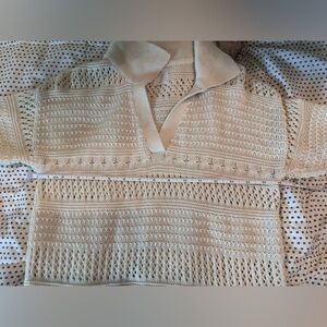 Elegant cream knit sweater. Features short sleeves and a stylish collar. Perfect for layering.