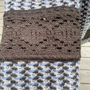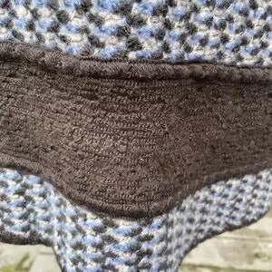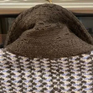 Chicly authentic Missoni coat with a tweedy textured pattern. Features rich brown and lavender grey hues. Double breasted jacket closes with three sets of handsewn oversized snaps. Inset in sleeves and hem are chocolate brown crocheted panels.