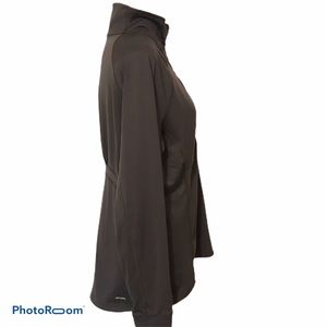 Add style to your workout! Deep Gray color, Ruched front with 1/2 Zipper, gathered on back, Princess cut style, fitted, flattering, Thumb holes, Climalite mesh lining wicks away moisture. Excellent Preloved Condition. Sleeves 30” Length 23 1/2” Bust 19”. Measurements are approximate.