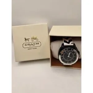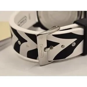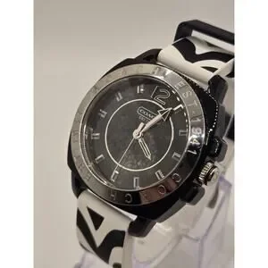 The new COACH 1941 Ladies' 41mm Black Ceramic Silicone Watch is a stylish and elegant timepiece designed for women. Featuring a black ceramic case with a silver bezel, this watch has a geometric dial pattern with stick indexes. It comes with a two-piece black silicone band and a buckle closure, making it comfortable to wear up to 7.5 inches in wrist size. The watch has a quartz movement, water resistance up to 30 meters, and a 12-hour dial. It also includes the original box, papers, and manual/booklet, making it a perfect addition to any collection for those who appreciate quality and sophistication in their accessories.