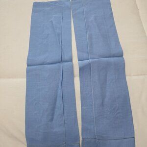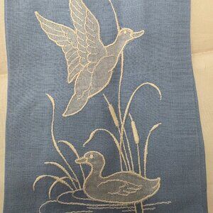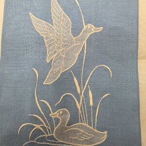 Set of two vintage blue tea towels featuring white embroidered ducks and cattails. Each towel is folded to approx. 10.5” x 5.5” (larger when unfolded).