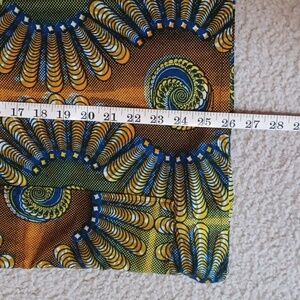 handmade top made with veritable afic block print fabric. size unknown, measurements pictured. short sleeve. partial button up neckline. rosette design buttons. bottom button is decorative. 100% cotton. vibrant colors of green, yellow, orange and rust. two side pockets. vintage. unisex. good pre-owned condition.