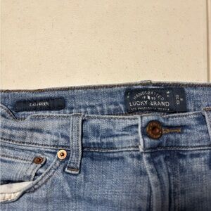 Stylish light women’s blue jeans by Lucky Brand with a straight leg cut. Size 10. Inseam 30”.