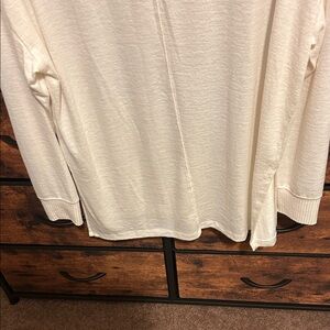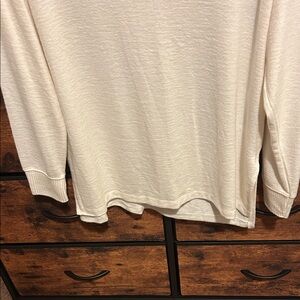 Soft cream long sleeve with a relaxed fit. V-neck design for casual elegance.