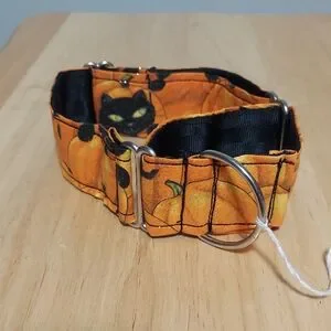 Festive Martingale-style dog collar with pumpkin and cat design. Perfect for Halloween. (fits up to 18" neck).