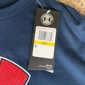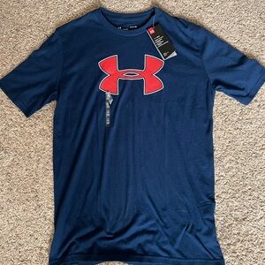 Stylish dark blue tee with bold red Under Armour logo. Ideal for everyday wear.