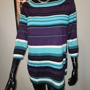 Stylish St John top with purple, teal, and white stripes. Features a comfortable fit and 3/4 sleeves.