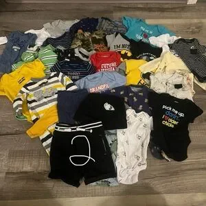 A collection of colorful baby clothes including onesies, shirts, and shorts. Features various designs and patterns.