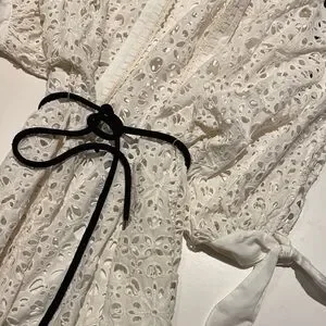 Elegant white lace coverup. Features intricate cut-out design. Ties at the waist and sleeves.