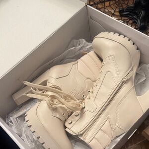 Step out in style with these elegant cream lace-up high heel boots. Perfect for adding a touch of sophistication to any outfit.