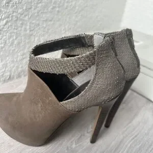 Chic taupe booties with textured accents. High heel design for a stylish look. Ideal for elevating any outfit.