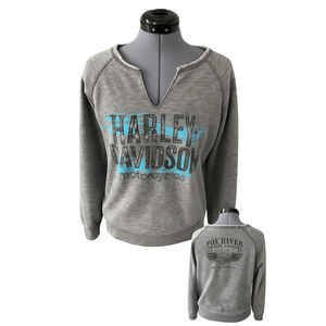 This authentic Harley-Davidson women’s sweatshirt combines comfort with biker edge. Featuring a distressed Harley-Davidson graphic across the front with a bold blue accent, and a Fox River Harley-Davidson St. Charles, IL dealership graphic on the back, it’s a must-have for riders and collectors alike.
