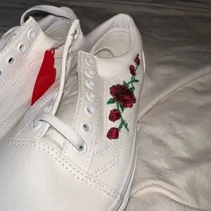 Chic Vans sneakers with vibrant red floral embroidery. Ideal for everyday style.