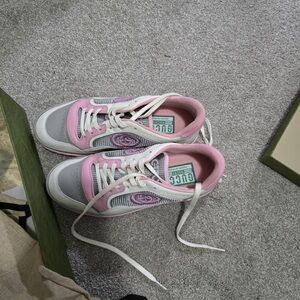 Elevate your look with Gucci's pink and gray sneakers. Perfect blend of style and comfort.