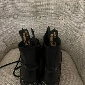 Classic black combat boots. Iconic yellow stitching. Durable leather construction.