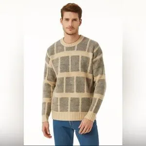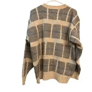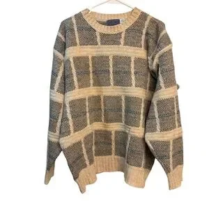 This is a preowned vintage Pendleton wool pullover sweater, likely from the 1990s. it's crafted from 100% virgin wool or a wool blend, emphasizing warmth, comfort, and durability, typical of high-quality vintage knitwear. It features a gray and blue design that resembles a patchwork. The sweater is textured as was typical with classic 1990’s styles. No holes stains or flaws.