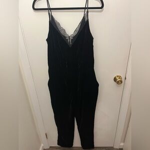 Chic black velvet jumpsuit with lace trim. Features a sleek silhouette and adjustable straps and pockets. Ideal for evening wear.