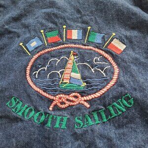 Features sailboat embroidery with nautical signal flags and colorful patchwork stripe details.
