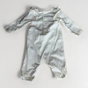 Adorable Carter’s long sleeve romper for baby girls in size 3 months. Features soft ivory cotton blend fabric with colorful floral embroidery across the chest, ruffle shoulders, and convenient snap closures at the back and bottom for easy diaper changes. Perfect for everyday wear, photos, or special outings.
