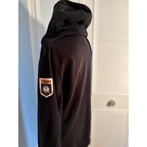 Black full-zip hoodie with Front Pockets and several patches, including one with "83" and "ALPHA CAP" on the left sleeve, and another large triangular patch on the chest with "CITY", “Freedom” and "PREMIUMGRADE" visible.