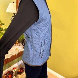 Elegant blue quilted vest. Ideal for layering. Features button closure and pockets.