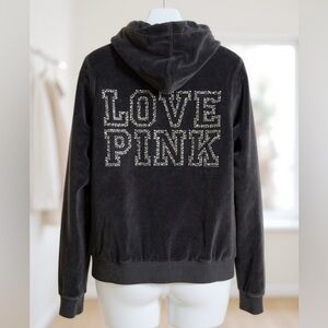 Cozy and comfortable black velvet soft hoodie with charming Love Pink and dog embellished motif and Ideal for casual wear, in good condition. Zipper pull has minor wear.