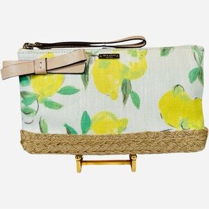 Stylish wristlet with a vibrant lemon design. Features a charming bow accent and woven detail.
