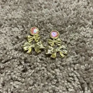 Chic gold earrings with pink accents. Features a stylish bow design. Ideal for any occasion.