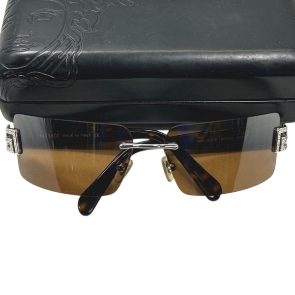 Elevate your style with these Versace brown sunglasses with bling. Perfect for any occasion, they offer both fashion and function. Good previously owned condition with minor flaws as seen in pictures. Comes with original case.