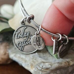 Alex and Ani's silver bracelet showcases delicate charm designs that are crafted with precision.