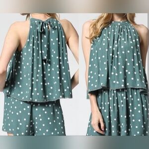 Stylish green polka dot halter top and shorts set. Perfect for casual outings.