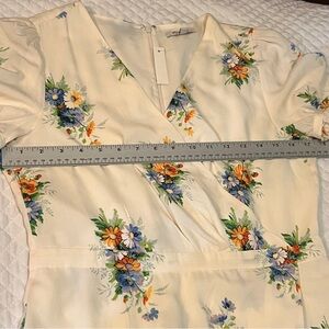 New with tags! Full zip behind, lined, faux wrap. Chic cream dress with colorful floral design. Features long sleeves and a flattering fit.
