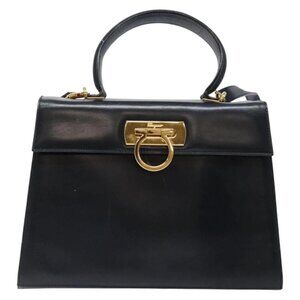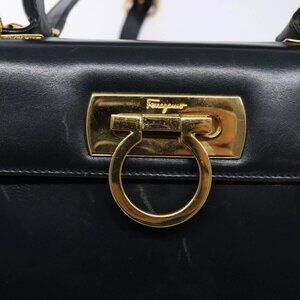 Salvatore Ferragamo Gancini Hand Bag Leather 2way Navy Gold Auth