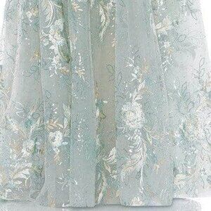 Floor length evening gown features an illusion sweetheart neckline that is accented with floral embroidery and rhinestones. A full a-line skirt and sweeping train completes the look.