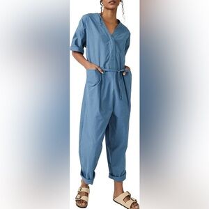 This all-cotton jumpsuit features breezy details like wide sleeves, chunky patch pockets and waist ties for a utilitarian-inspired vibe.